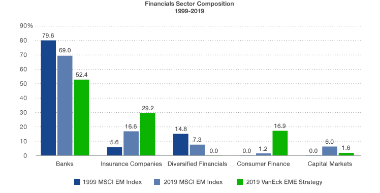 Die VanEck Emerging Markets Equity Strategy ist ein aktiv verwaltetes Bottom-up-Portfolio von Wachstumswerten, das in der Regel nicht in zyklische Large-Cap-Substanzwerte investiert. Viele dieser Titel sind Unternehmen im Staatsbesitz, die dem Finanzsektor zugeordnet werden. Da die Strategie zum 31. Oktober 2019 zu 31,1 % im Finanzsektor investiert war, ist es wichtig, unsere Gewichtung in diesem Sektor zu verstehen. Der folgende Artikel analysiert den Finanzsektor und seine Zusammensetzung und erklärt, warum wir von der größten Sektorposition des Portfolios überzeugt sind.