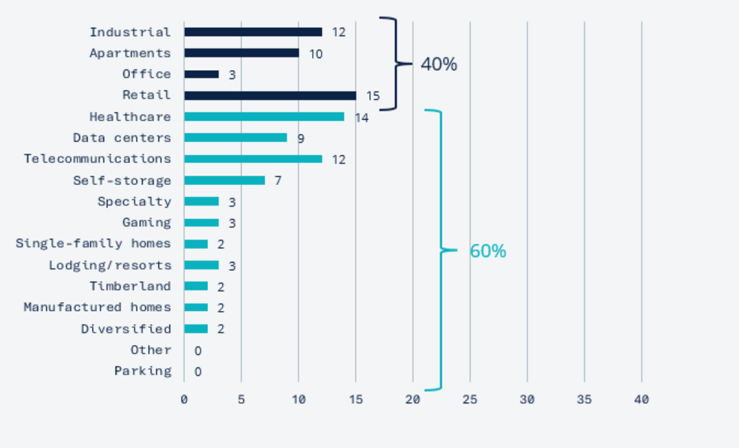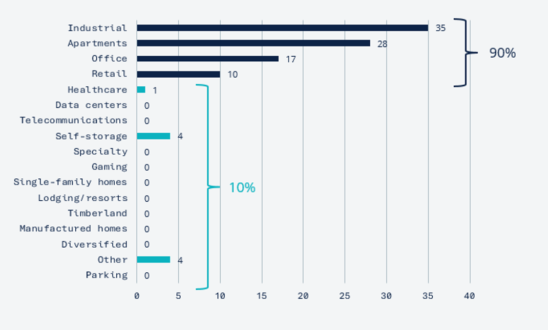 Private vehicles offer direct ownership and appraisal-smoothed volatility; listed vehicles offer daily liquidity, transparency, and efficient rebalancing. The practical advantages of REITs – no cash drag, no lock-up, the ability to tactically tilt sector or geographic exposures – are well understood by institutional allocators. Norges Bank Investment Management runs a roughly 50:50 split between private and listed real estate1, while Dutch institutions such as Bouwinvest and MN use REITs as completion portfolio mechanisms2. Listed real estate also provides exposure to segments difficult to access via private vehicles. The ODCE Index has roughly 90% exposure in industrial, apartments, office, and retail3, whereas listed real estate has approximately 60% outside those categories.