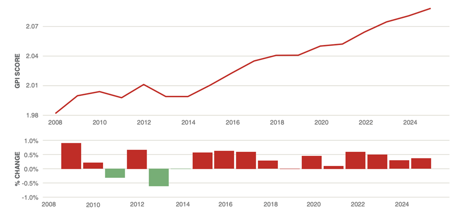 GPI Overall Trend and Year-on-year Percentage Change, 2008-2025