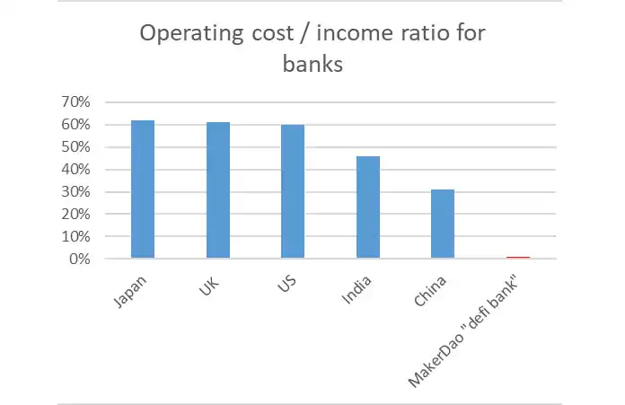 "The yield has always been there," Alex Mashinsky told us. Alex is CEO of Celsius, whose deposit-taking crypto bank currently pays 8.88% interest on stablecoins in Europe and has attracted $20B in customer deposits. "It's just that in the past it has been hoarded by the banks, and now it's available to everyone." I don’t know what Celsius profit margins are, but the largest decentralized bank Maker Dao sports a cost/income ratio of 1%. The developed market bank average is closer to 60%. The difference ends up in the wallets of all network participants.